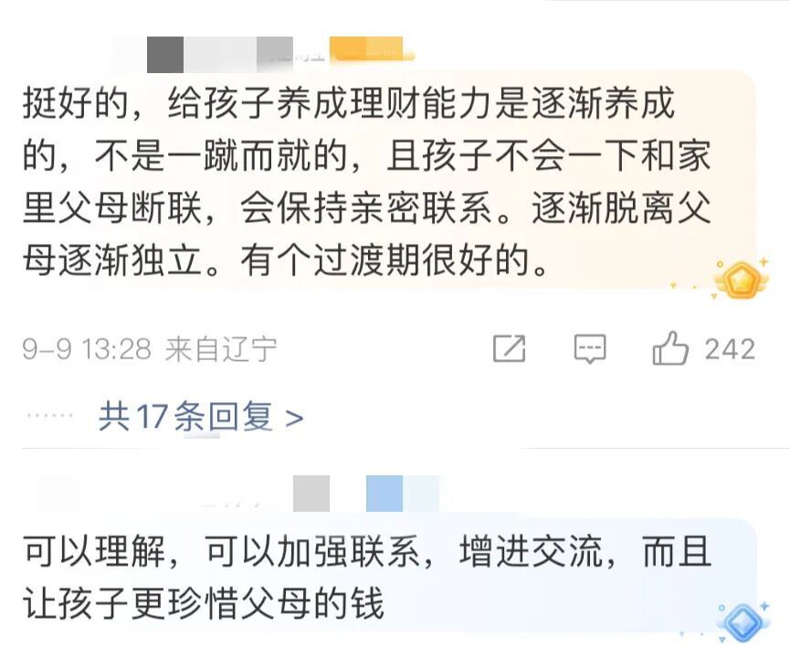 有网友认为父母用心良苦,有网友认为一次性给有助养成规划习惯,也有不少网友提出反对,认为“每天联系”显得过于紧张。